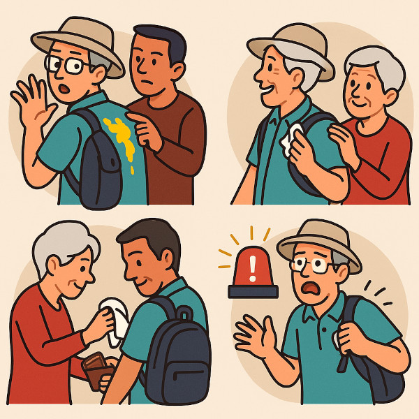 The "Mustard Scam" (a.k.a. Bird Poop Scam)This is a common distraction theft that targets tourists in popular European cities like Barcelona, Madrid, Rome, and Paris.